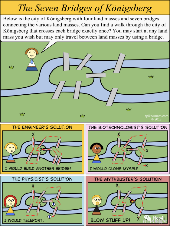 但 Euler 毕竟是数学家,反手就解决了这个问题,证明了没有方法能够一遍不重复地走完这七座桥,还发表了论文。