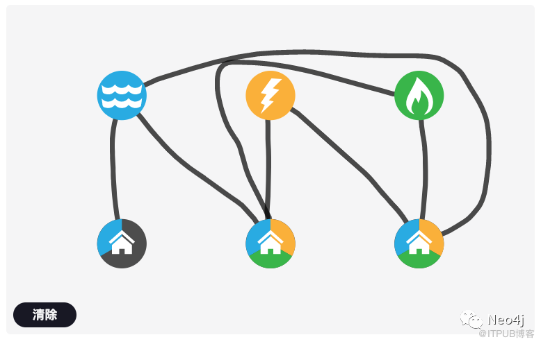 在一个小村庄里,有三间房屋和三座生产水、电和煤气的公用设施。我们必须将每个房屋连接到每个公用设施,但由于村庄的布局,不同的管道和电缆不允许交叉。