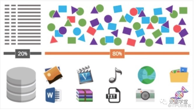 当前行业公认:非结构化数据占数据总量的80%以上。结构化数据仅占到全部数据量的20%,其余80%都是以文件形式存在的非结构化和半结构化数据,非结构化数据包含各种办公文档、图片、视频、音频、设计文档、日志文件、机器数据等。