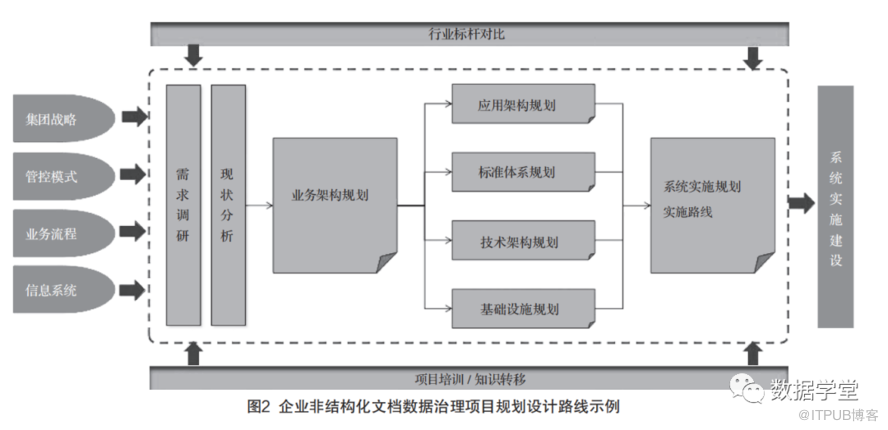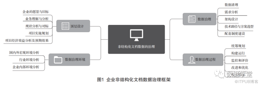 在“摸清家底”—现状调查和现状评估的基础上,结合《信息技术服务 治理 第5部分:数据治理规范》提出的数据治理框架,从顶层设计、数据治理环境、数据治理和数据治理过程四大部分开展非结构化文档数据的管理。