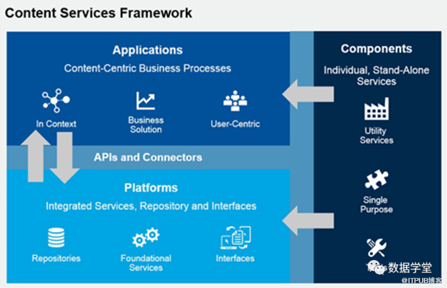 进一步分析 Gartner 内容服务框架,其主要包括内容管理平台、内容服务应用和内容组件。其中内容管理平台是底层内容统一存储和统一管理的基础平台,提供各种 API 接口和 Connector 连接器等集成支撑;内容服务应用强调以内容为中心的业务应用;内容组件是一种类似转档、预览、编辑等细颗粒的内容服务组件,其能力可输送于内容服务平台和内容服务应用。
