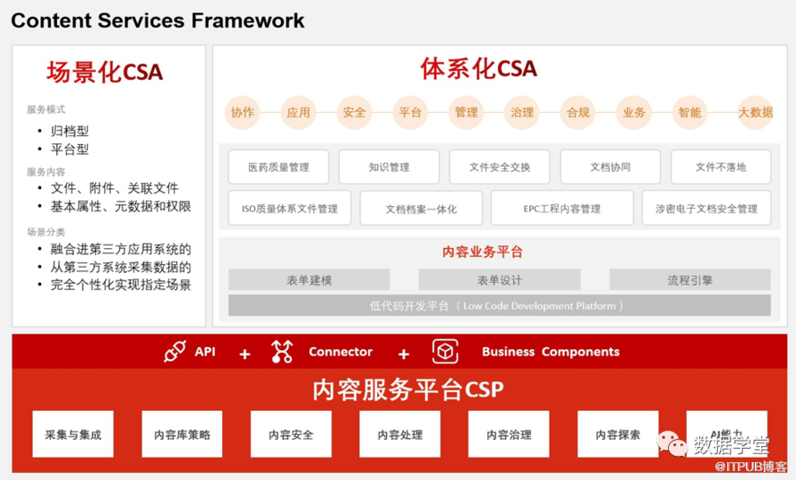 企业内容管理本质是为企业业务和数字化转型提供内容服务支撑,并具有内容服务的快速响应能力。基于内容服务平台 CSP 的内容服务应用 CSA 分为体系化 CSA 和场景化 CSA。其中体系化 CSA 覆盖垂直业务领域的内容服务,场景化 CSA 注重与第三方业务系统的集成和整合。