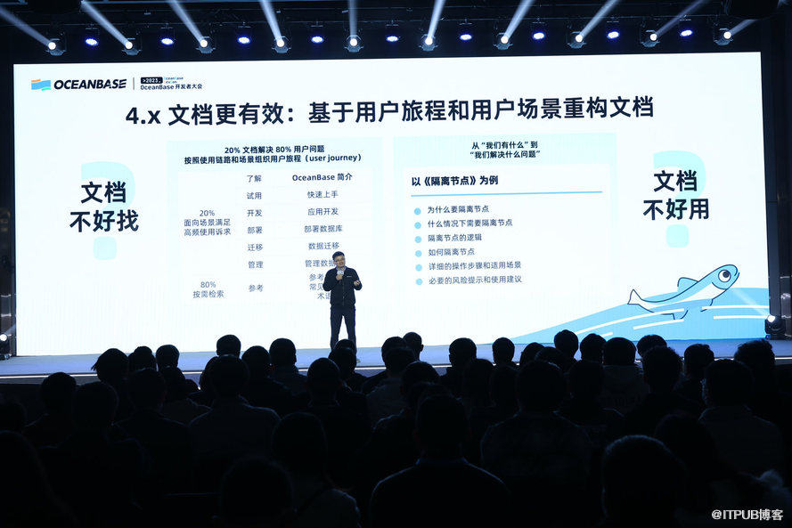 今天大会现场,OceanBase首次公布了四项“开发者友好”实践。一是,发布了OceanBase 4.1版本,4.1版本的内核能力及小规格综合读写性能得到提升。二是,推出向导式的安装部署。可实现2分钟部署demo环境,10分钟完成标准部署集群,降低了使用分布式数据库第一道门槛。同时,把开发工具(OCP Express)集成到社区版,降低运维成本。三是,推出场景化文档,解决文档“不好找、不好用”的问题。OceanBase基于用户旅程和用户场景对文档进行了重构,解决开发者现实使用场景中迫切需要的支持。四是,宣布将整体研发流程迁移至外部,统一企业版和社区版代码分支,让每一位开发者看到代码进展。同时,宣布即将开源三大开发者工具(ODC、OCP Express和MySQL binlog service)。
