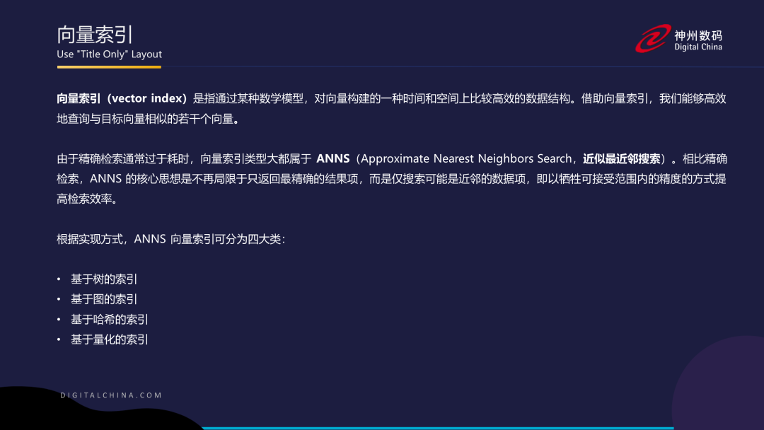 向量索引与关系数据库中的索引类似,但有一点不同。在向量数据库中,通过向量索引找到的是近似结果,而不是100%准确的结果。向量索引描述的是相似度的程度高和低。因此,我们称之为近似最邻近搜索(ANS)。如果没有向量索引的话,寻找一个向量的相似度就类似于关系数据库中的全表搜索。但是,在全表搜索之上还要多加一层的运算,因此成本比关系数据库中的全表搜索要高很多。