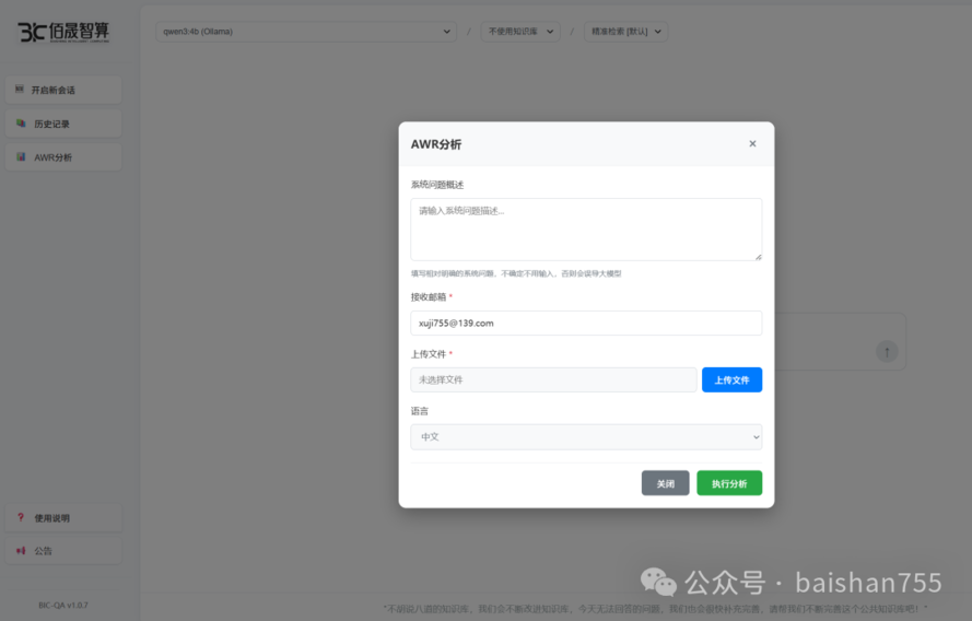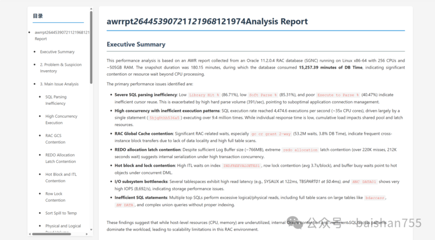 这是一个样例,目前报告输出支持中英日法德等语言。我们计划下周把BIC-QA 1.0.7的代码上传到GITHUB上,下载最新代码,覆盖到以前的1.0.6的目录上就可以升级,配置信息都不会被覆盖。AWR智能解读的结果中大体上还是对DBA有帮助的,不过里面可能还是会存在一定的幻觉。利用LLM,如果分析一个十分精确的案例,可以让幻觉消除到很小的范围,对于有上万数据,里面存在各种各样亚健康状态的AWR报告,哪怕是专家多次阅读,感受都会有所不同,想要让LLM生成出完全准确,没有幻觉的报告,难度太大了,目前阶段可能还做不到。不过通过解析报告再去分析问题,会更加清晰,也更加简单。相当于你让一个水平不错的助手帮你先把AWR报告认真分析一遍,把发现的问题都标注出来,设置优先级,然后你粗略的过一下结果。