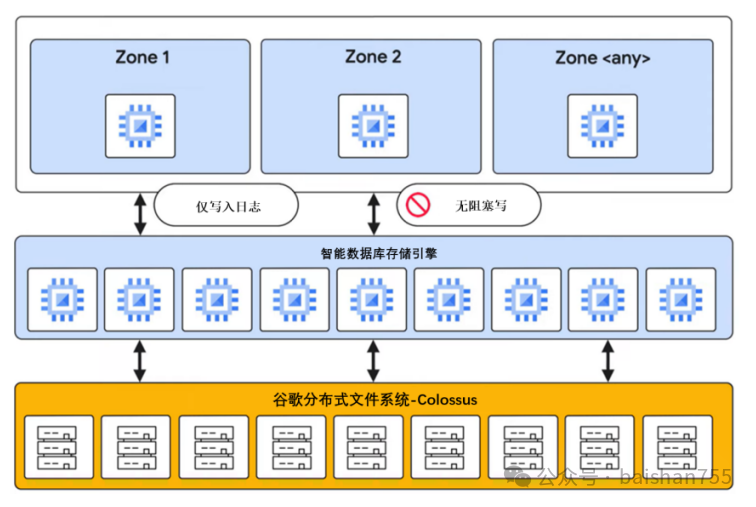如上图,AlloyDB是一种日志即数据库概念下的共享块存储的读写分离架构的数据库。主库负责写入与部分读操作。备库无需复制,通过LPS服务直接使用Buffer Cache的数据实现只读操作,其一致性是很强的。通过并行的LPS可以并发处理大量的WAL写入和BLOCK落盘,通过低延时的LOG STORE,可以快速完成WAL落盘,避免引起数据库事务提交的性能问题。这也是AlloyDB的部署不支持跨数据中心的主要原因(跨数据中心需要通过复制)。AlloyDB的只读节点提供接近实时(Near Real‑Time)的复制延时,其延时为WAL flush → 读节点接收 → 内存缓存更新的链路延时。