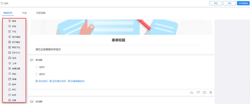 创建空白模板:在表单编辑状态下,点击或拖拽左侧题型可将选中的题型直接添加到表单编辑区域,比如单选题、多选题、下拉、两级下拉、填空、评价打分、姓名、手机号码、插入图片和电话咨询等20多个题型快速创建表单内容,还能通过可视化拖拽移动题型位置。