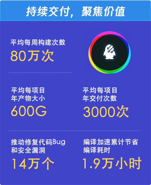在研发的持续交付方面,腾讯平均每周构建次数达80 万次,项目年均产物大小 600G,年均交付次数3000 次,推动修复代码 Bug 和安全漏洞 14 万个,编译加速累计节省编译耗时 1.9 个万小时。