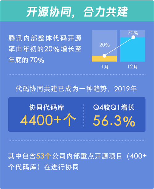 在内部开源方面,腾讯内部整体代码开源率由2019 年年初的 20% 增长至年底的 70%,代码协同共建已成为一种趋势。其中,2019 年腾讯内部新增协同代码库超过 4400个,Q4 较 Q1 增长了 56.3%。其中包含 53 个公司内部重点开源项目(涉及 400 多个代码库)在进行协同。