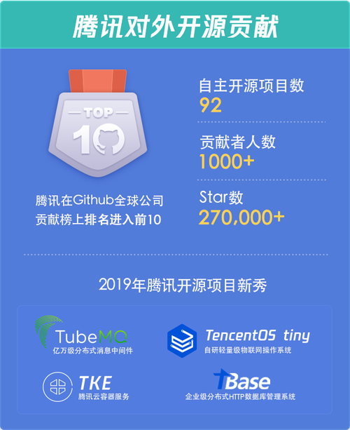 2019年全年,腾讯开源超过22个项目,包括 TubeMQ 亿万级分布式消息中间件、TencentOS tiny 自研轻量级物联网操作系统、TKE 腾讯云容器服务和TBase 企业级分布式 HTTP 数据库管理系统都在2019年接连开源。