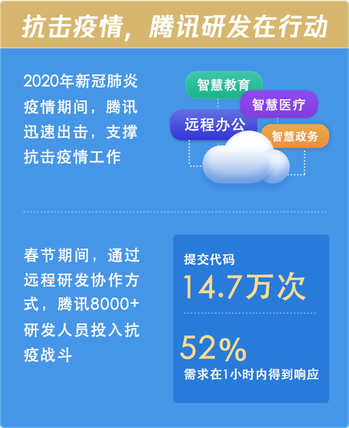 春节期间,腾讯有8000多名研发人员通过远程研发协作方式投入抗疫战斗,为了给社会提供更好的服务,各领域产品及时响应、快速迭代,共提交代码14.7万次,52% 的需求在 1 小时内就能得到响应。各领域产品全力抗疫的背后,是腾讯研发能力多年的沉淀,也是腾讯新代码文化的外在彰显。