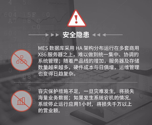 · MES数据库采用HA架构分布运行在多套商用X86服务器之上,难以做到统一集中、协调的系统管理;随着产品线的增加,服务器及存储数量越来越多,硬件成本与日俱增,运维管理也变得日趋复杂。