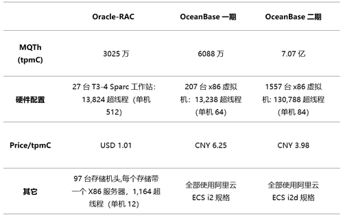 ·OceanBase的高性能完全不依赖高端或专用硬件,两次TPC-C测试OceanBase跟随阿里云升级趋势分别使用了两种不同规格的通用ECS虚拟机。而用户在搭建自己的OceanBase集群时,同样可以丰俭由人,选取适合实际业务情况的硬件配置即可。
