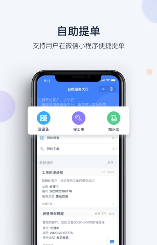 客户通过微信小程序自助提工单,方便快捷,随时查询服务进度、接收服务通知