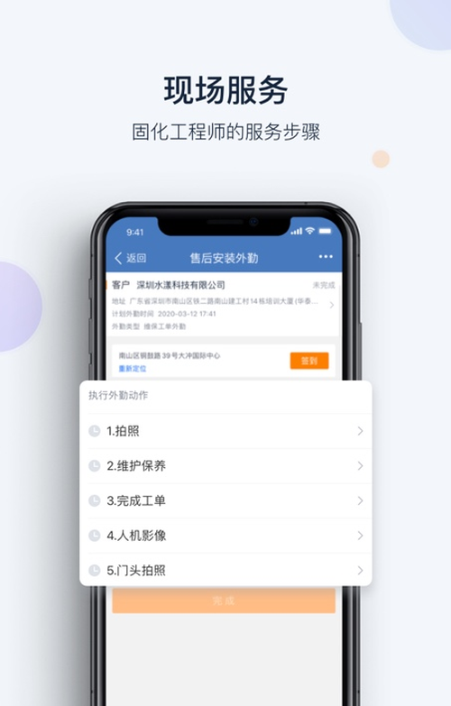 企业自定义现场服务流程,工程师按照预设步骤执行服务,上传服务凭证,确保服务规范