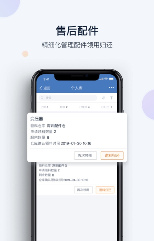 移动端记录售后配件使用情况(领、用、退),并与公司库存实时联动,精细化管控业务流程,提升工程师工作效率