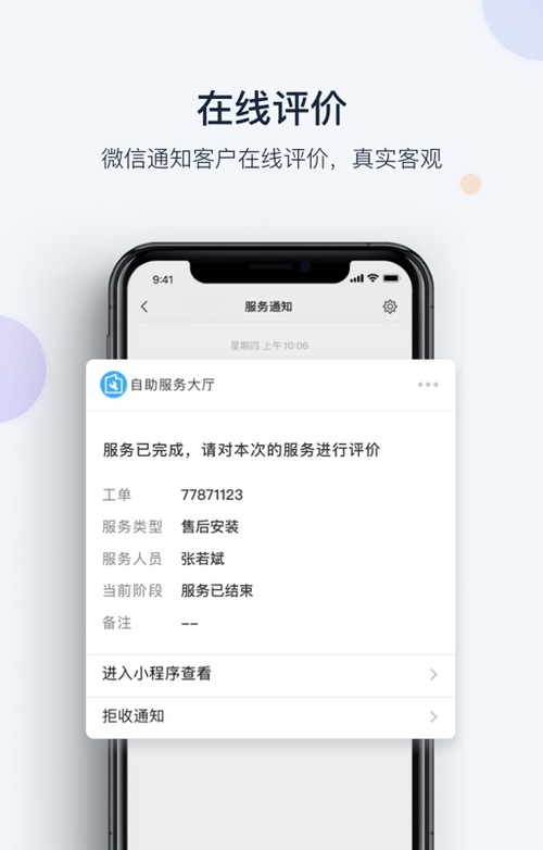 服务完成后,评价通知自动推送至客户微信,在线评价,及时反馈服务情况,真实客观