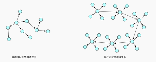 针对这种推广活动,关系型数据库里最简单的存储方式是分为邀请注册表和积分兑换表两张表,通过统计的方式去识别黑产团伙,比如每个独立设备登陆的账户数,每个IP上登陆的账户数等等。然而黑产团伙可以通过群控设备,虚拟IP等等技术来绕开这些检测。