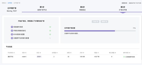 不同于其他私有云扩容时需要手工配置节点,手工安装操作系统,易捷行云新一代私有云ECS具备节点自动发现功能,在扩容时无需手工安装和配置,支持自动扩容预检,扩容进度实时显示,扩容操作图形化展现,不仅避免了人工配置误操作引发的平台故障,且在扩容过程不影响正常运行的业务,支撑业务高稳定性、高性能需求,快速完成集群节点添加。