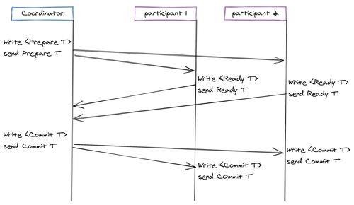 如果所有参与者回应Ready T,则TC先写<Commit T>日志并持久化,再向所有参与者发送Commit T消息。