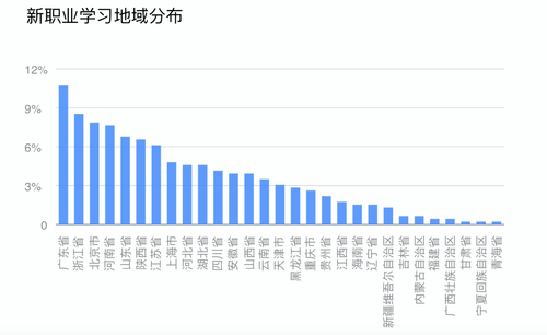 《报告》显示,在地域分布上,广东、浙江、北京、河南、山东、陕西、江苏、上海、河北、湖北、四川学习新职业人数位居前列,其中广东用户最爱学习新职业。
