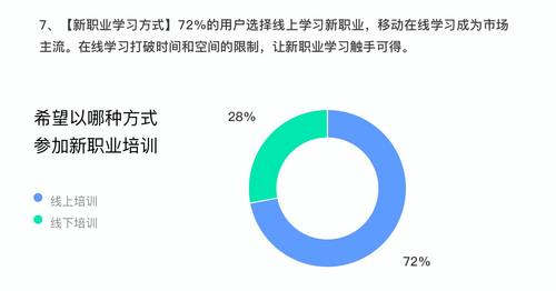 《报告》显示,在新职业学习方式的选择上,72%的用户选择线上学习新职业。移动在线学习打破了时间和空间的限制,将成为未来主流学习方式。
