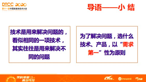 通过分析这三类技术路线,达梦认为是不是分布式其实并不重要,还是要回到发展技术的初衷来看“需求第一性”。站在用户的角度要不要用分布式数据库?怎样用分布式数据库?用户应该要对自己的需求非常清楚,然再去选数据库。