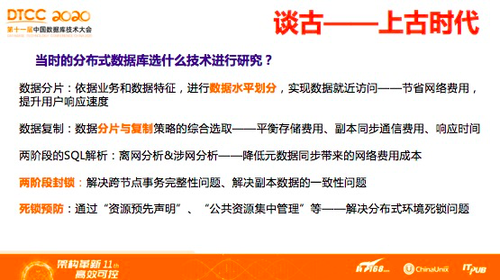 当时的分布式数据库选的什么技术进行研究?我们能发现,其中很多词在今天是非常熟悉了,比如数据的划分,水平划分还是垂直划分,分片存储还是复制存储,数据分布以后如何保证事务完整性?怎么实现数据提交?怎么预防分布式环境下的变化?