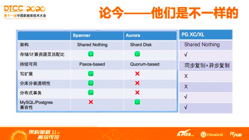 我们找到一些参考资料,只针对Spanner和Aurora进行了对比,我个人把PG也加进来了。可以看到,虽然大家都叫分布式数据库,但实际上细节不一样,这说明实现目标不一样。如果仔细去看的话,有的是共享存储架构,有的是非共享。今天,因为时间有限,我们单独拎出来一个点看一看,比如持续可用。为什么不同的分布式数据库会选择不同的数据库协议?强调一下,之前我形成的第一个结论,为了解决产品的问题,用户和开发人员都是以“需求第一性”原则为主。