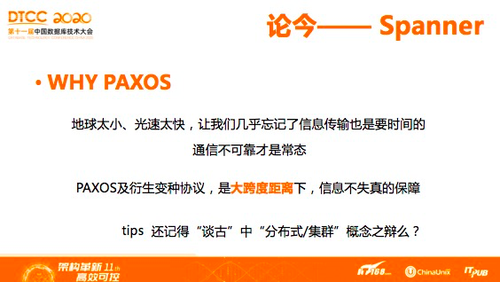 为什么Spanner要做PAXOS?Spanner是Google自用的数据库,虽然后来发布了Cloud Spanner,但在最初,它是给Google广告系统用的。Google是一个全球化的公司,业务遍布全球,用户遍布全球,分布式机构也是遍布全球,全球化的公司就有全球化的利益,什么叫做全球化的利益?就是当一个区域甚至一个大洲发生不可控的因素的时候,利益不会受损,业务可以持续运转,需要一个能够维护全球利益的数据库,也就意味着遇到局域性的灾害、疫情甚至政治不稳定、海底光缆故障大面积设备失效,也可以保证其业务持续不断地赚钱,也能为客户带去它的价值,这是Google对数据库的诉求。正因为如此,Google第一篇论文并非冠以分布式数据库,而是冠以全球分布式数据库的名字和原因。
