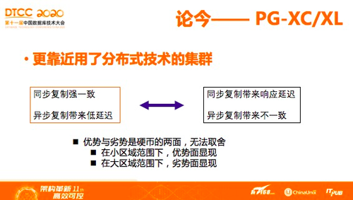 众所周知,PG-XC/XL的经典版本,或社区版本当中用的是传统复制技术,保证同步复制和异步复制,好处是同步复制带来强一致,异步复制延迟较低,但这是在一个小距离环境下看到的,也就是一个硬币正面和反面的问题。要是这个距离扩大到一千公里级别,硬币的另外一面就会显现出来,在大区域范围下,同步复制的延迟以及异步复制带来的不一致性问题就会显现。PG这套系统如果视之为集群效果非常好,有着更好的响应时间、运维和线性扩展效果,所以,这套系统更适合小范围部署的、追求线性扩展的用户。