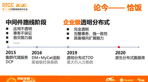 到了2019年,达梦认为从现状上来看,分布式数据库最大的问题是兼容性代价太高,所以,达梦更提倡透明式TDD的概念,在保障数据库通用性、具有比较强的一致性前提下,同时具备一些可扩展的能力。