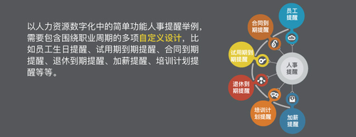 制造业存在多世代劳动力,由于产业链的工作人员涵盖多个年龄段和背景,所以并不能将人视为组织中可以互相替换的齿轮,而应将人视为具有独特经验、思想、态度、需求的个体,并重视其价值。这使得工作中对于人的因素的管理比以往更重要、也更复杂。以人力资源数字化中的简单功能人事提醒举例,需要包含围绕职业周期的多项自定义设计,比如员工生日提醒、试用期到期提醒、合同到期提醒、退休到期提醒、加薪提醒、培训计划提醒等等。在人才激励与保留项目设计时,制造业需要用更即时、更便捷的方式满足多世代劳动力被认可的欲望。