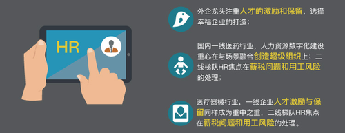 在医药行业,外企龙头注重人才的激励和保留,选择幸福企业的打造;国内一线医药行业,人力资源数字化建设重心在与场景融合创造超级组织;二线梯队HR焦点在薪税问题和用工风险的处理。细分在医疗器械行业,一线企业人才激励与保留同样成为重中之重,二线梯队HR焦点在薪税问题和用工风险的处理。总体来看,医药行业从人才竞争和行业挖角,逐渐转型为人才激励、人才培养和人才保留。各类型企业在新人力资源数字化转型道路上,选择量体裁衣。