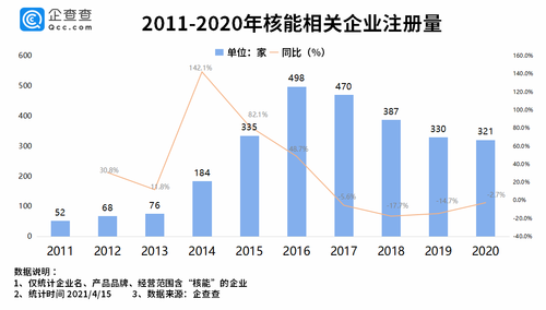 从近十年核能相关企业发展状况来看,企查查数据显示,2011-2016年之间企业注册量不断增长,2016年达到十年中最高的498家,随后几年数据逐年下降,2020年新注册企业321家,比2019年少9家。