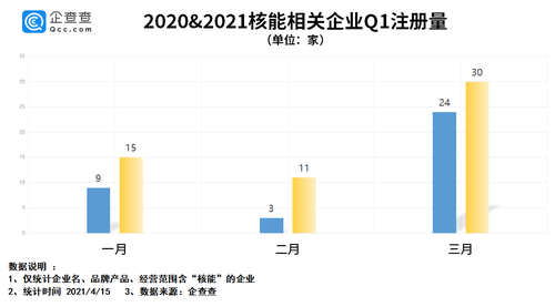 企查查数据显示,2021年第一季度,我国核能相关企业注册量为56家,同比上涨了55.6%。其中,3月份注册量为30家。