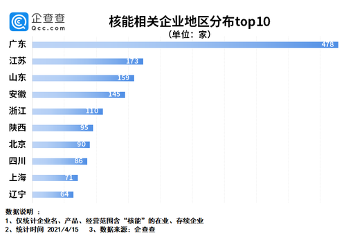 从地域分布来看,企查查数据显示,目前我国在业、存续的核能相关企业主要分布在广东、江苏、山东等省份。其中广东省拥有最多的核能企业,共478家。此外,江苏、山东、安徽、浙江核能相关的企业均超过了100家。
