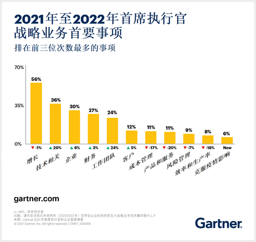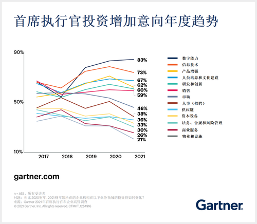 Gartner 2021年首席执行官调查收集了来自30多个国家、465名业务领导人的答复。Gartner每年开展一次首席执行官调查,迄今已持续了10多年。这项调查主要研究业务态度以及业务领导人最关心的优先事项。