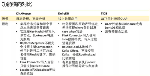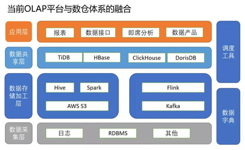 数据共享层主要有TiDB/Hbase/ClickHouse/DorisDB。通过DorisDB和ClickHouse提供的高速OLAP查询能力,在应用侧承接了报表平台,提供即席分析的平台,对开发侧提供数据接口,以及实现多个数据产品(比如流量分析平台,用户标签平台)。