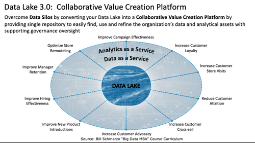 如果寻求利用数据的独特特性——资产永不枯竭、永不磨损,并且可以在无限数量的用例中以零边际成本使用——那么必须消除阻碍数据经济乘数效应的数据孤岛。我们可以通过将组织的数据湖转变为“协同价值创造”平台来释放数据经济乘数效应,该平台支持组织数据和分析资产的捕获、共享、重用和持续改进(见图 3)。