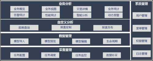 基于九商现有环境,可从集中监控平台、BPC平台和日志分析系统收集全网业务系统数据,集中整合加工,建立业务系统大数据分析平台。建设目标为,一是提供业务概览、业务统计等展现功能支撑银行监督与决策;二是提供告警预测、交易预测等大数据分析能力辅助运维人员进行业务监控以及故障处理;三是提供用户管理、菜单管理、权限管理等系统功能支撑系统管理员进行系统的日常维护。