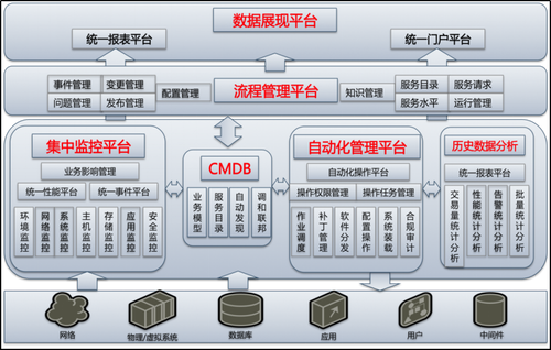 IT运维管理框架从逻辑结构上划分为五个平台和一个中心配置库,分别是数据展现平台,流程管理平台,集中监控平台,自动化管理平台,历史数据分析平台以及CMDB配置管理核心库。