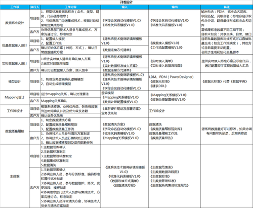首先,将数据治理执行过程进行流程化梳理,可以将数据治理工作拆分为需求调研、概要设计、详细设计、数据开发、部署运维、培训六个阶段。同时针对以上流程规范各节点标准输入输出项,同时将标准输入输出进行模板化。包括:源系统业务侧调研、源系统技术侧调研、业务流程图、网络架构图、业务系统台账等。另外针对行业通用知识梳理完善以后积累沉淀成行业版知识(抽离通用版),如标准文件梳理:1.代码表整理,2.数据元标准整理(数据仓库行业模型对应标准梳理)。