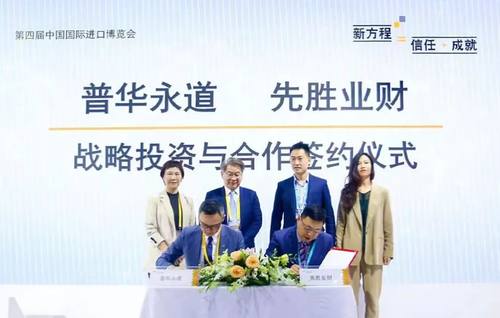 本次战略投资与合作签约仪式在第四届中国国际进口博览会上举行,先胜业财创始人兼CEO杨皓,先胜业财创始人兼COO胡彦轩,先胜业财市场副总裁才睿,普华永道中国咨询部主管合伙人吴家裕,普华永道中国创智中心合伙人林榕,普华永道中国企业治理、风险和合规咨询合伙人蔡耿青,普华永道中国企业治理、风险和合规咨询合伙人陈亮共同出席见证签约。