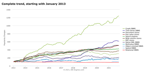 从上图DB-Engines数据库流行度变化可以看到,图数据库一枝独秀成为近10年来关注度增长最快的数据库,也吸引了投资者的青睐,目前为止数据库领域最大单笔融资就诞生在图数据库。从2021年8月到11月,三个月时间DB-Engines收录的图数据库产品数量从32家增加到36家,可见其火爆程度,其中有4家国产图数据库产品上榜,欧若数网Nebula Graph排名15。在图数据库领域,国内外基本处于同一起跑线。