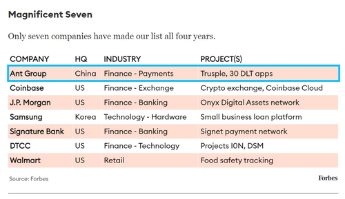 今年是《福布斯》连续第4年评选“全球区块链50强”。从评选结果来看,有7家公司连续4年上榜,其中蚂蚁集团凭借蚂蚁链成为中国唯一一家连续4年上榜的公司。而嘉吉、IBM、ING、微软、VMware连续在榜3年后首次掉出榜单。
