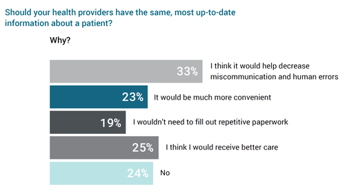 四分之三(76%)的人同意医疗服务提供者应该拥有关于病人同步最新的信息,原因包括改善护理、减少人为错误以及为病人提供更大的便利。