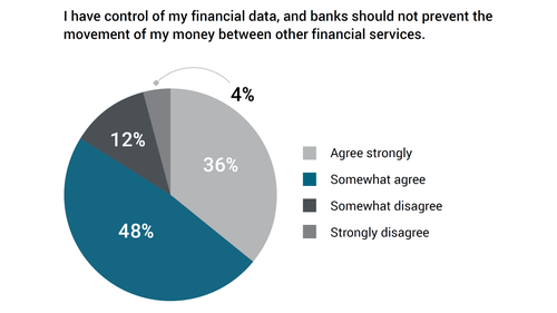 84%的受访者同意他们应该控制自己的金融数据,而且银行不应阻止资金在其他金融服务之间的流动——这些原则是开放银行的基本原则。