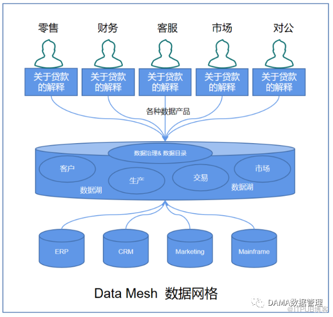 一个主要区别就是这个第二层,在数据编织中,数据是按数据库类型经过转换的规整数据,有点Bill Inmon理念数据仓库的意思吧,数据是处理加工过的,方便给顶层调用。而数据网格的数据是全部在数据湖中,还都是原始格式存储,有点Kimball理念数据仓库的意思吧。