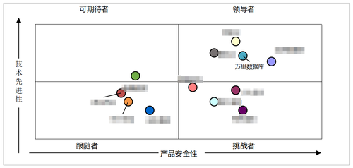 赛迪报告评价模型采用竞争力四象限图模型,从技术先进性和产品安全性两个维度对企业展开评估。从象限图中可以看到,万里数据库处于领导者象限的中间位置,在产品安全性和技术先进性方面,与国内熟知的一些数据库厂商位于同一领先水平。